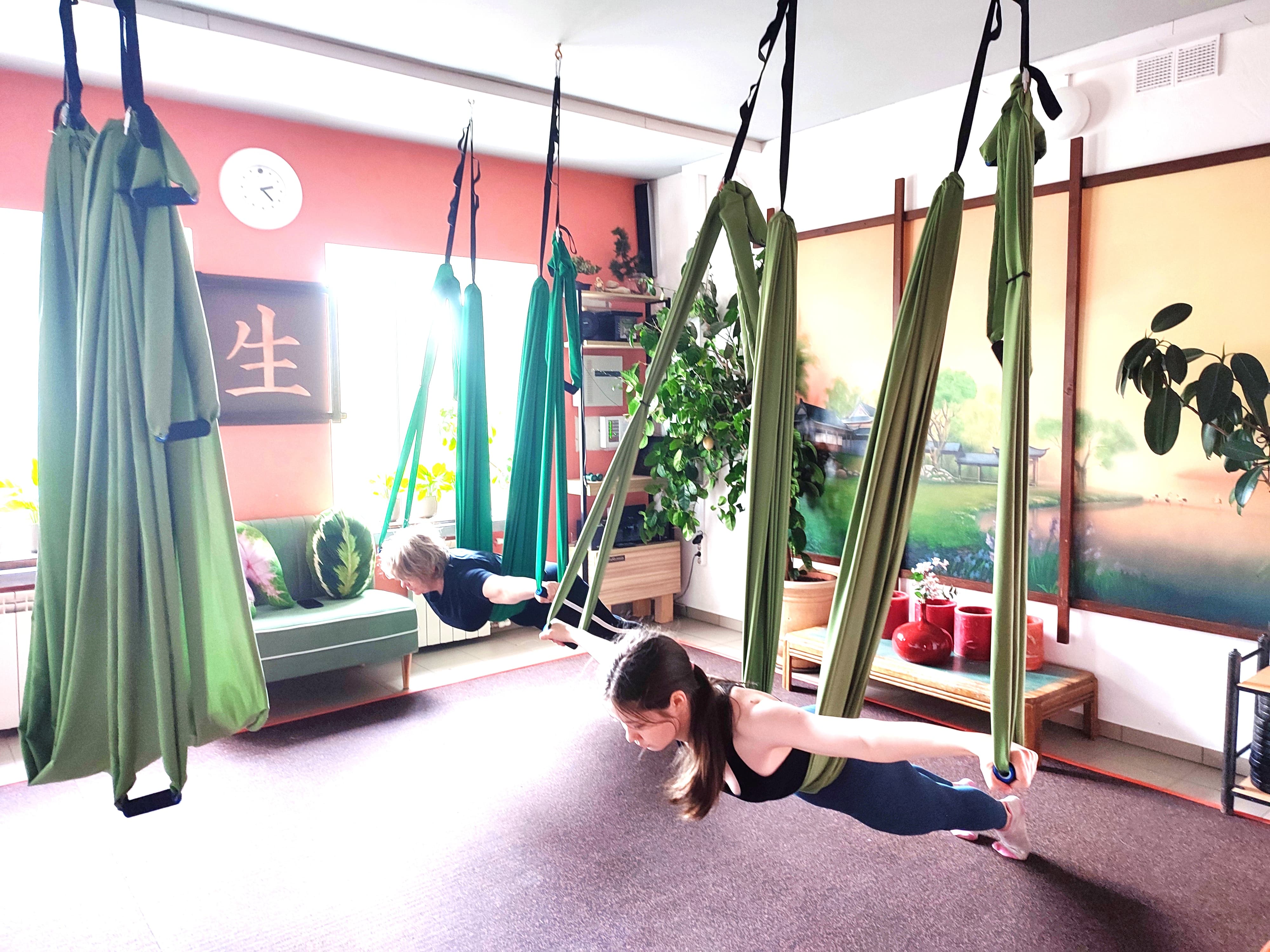 Во время занятий в гамаке вы можете сосредоточиться на своем дыхании и настоящем моменте. Это помогает вам отключиться от повседневных проблем и стресса, и полностью погрузиться в практику.